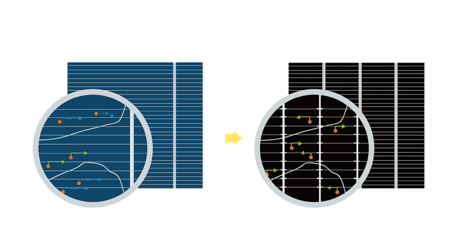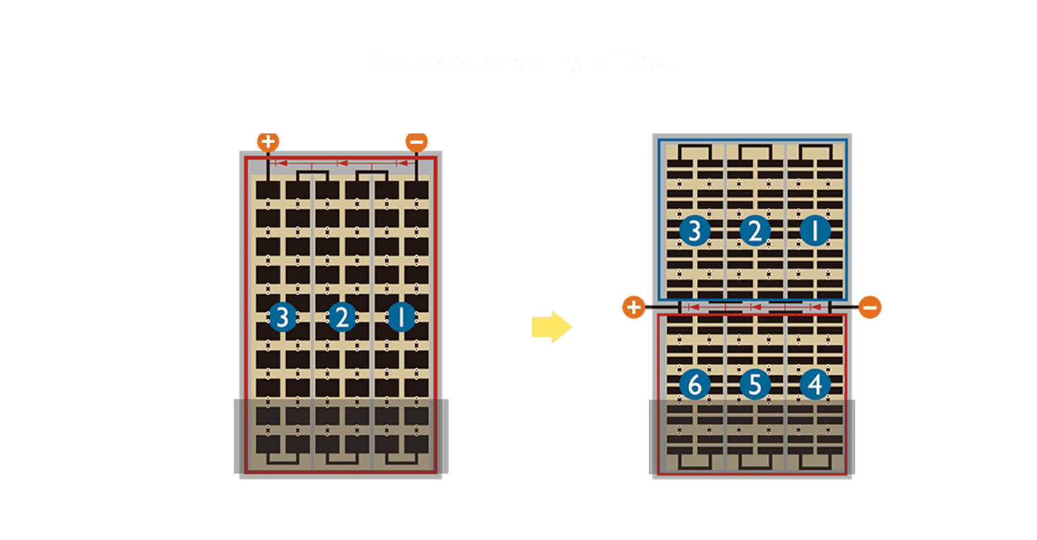 - 结合半切电池,,,降低遮阴影响、、、、提升模组抗隐裂能力、、、、并减少电阻损耗,,,进一步提升模组发电效能。。。