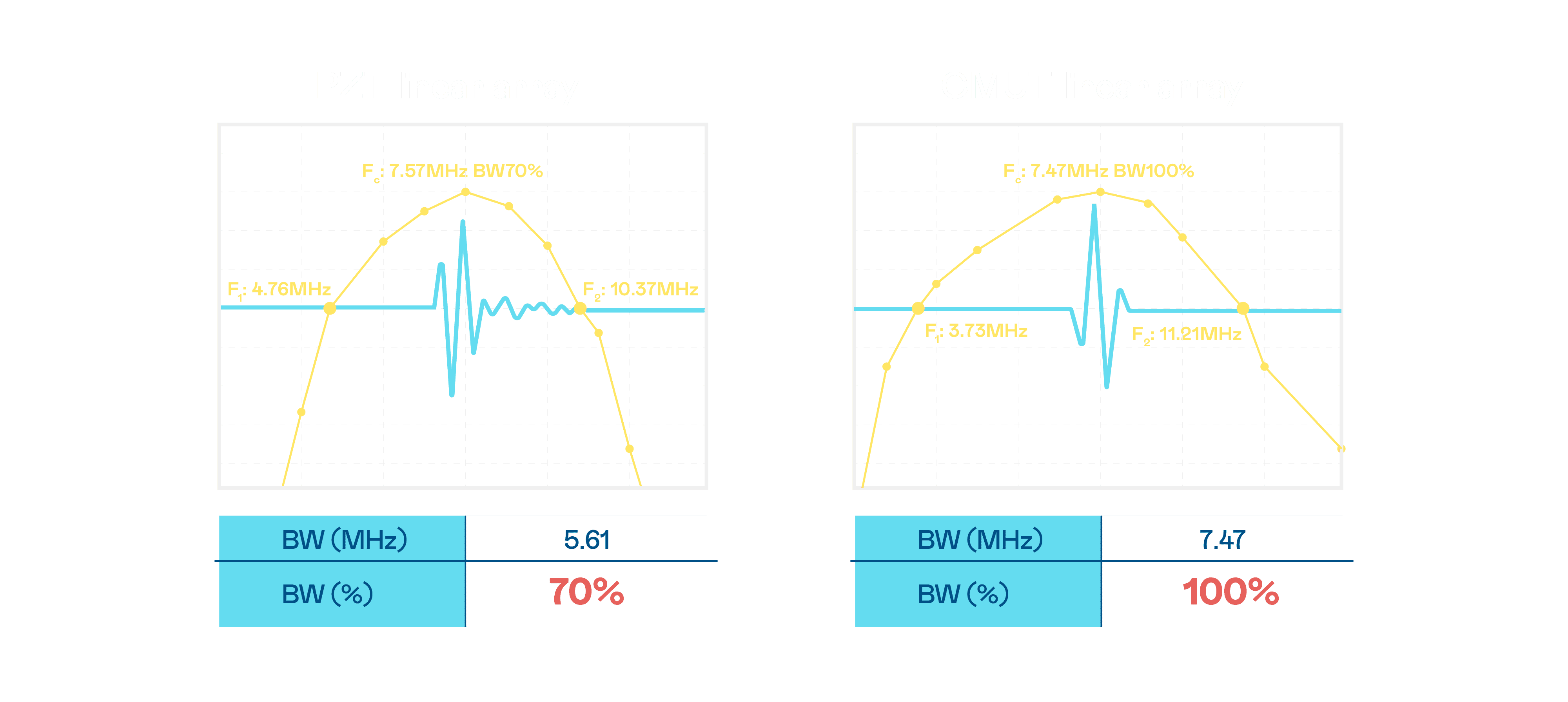 超音波影像的解析度高低,,,,首先取决于探头能发出的讯号频宽。。。冰球突破 CMUT 可提供高清晰的超音波讯号,,提供高频宽、、、、高灵敏度、、、影像纹理细节更高的超音波影像,,,,协助医护人员缩短影像判读时间及利用精准的医疗影像进行诊断。。